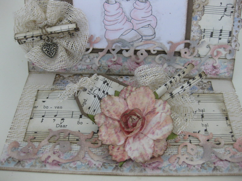 This easelcard gives me a Shabby chic feeling with all the colours I used and the many distressed items. The lovely stamp is a digi from http://saturatedcanary.blogspot.nl/ . I coloured here with Derwent pastel pencils.